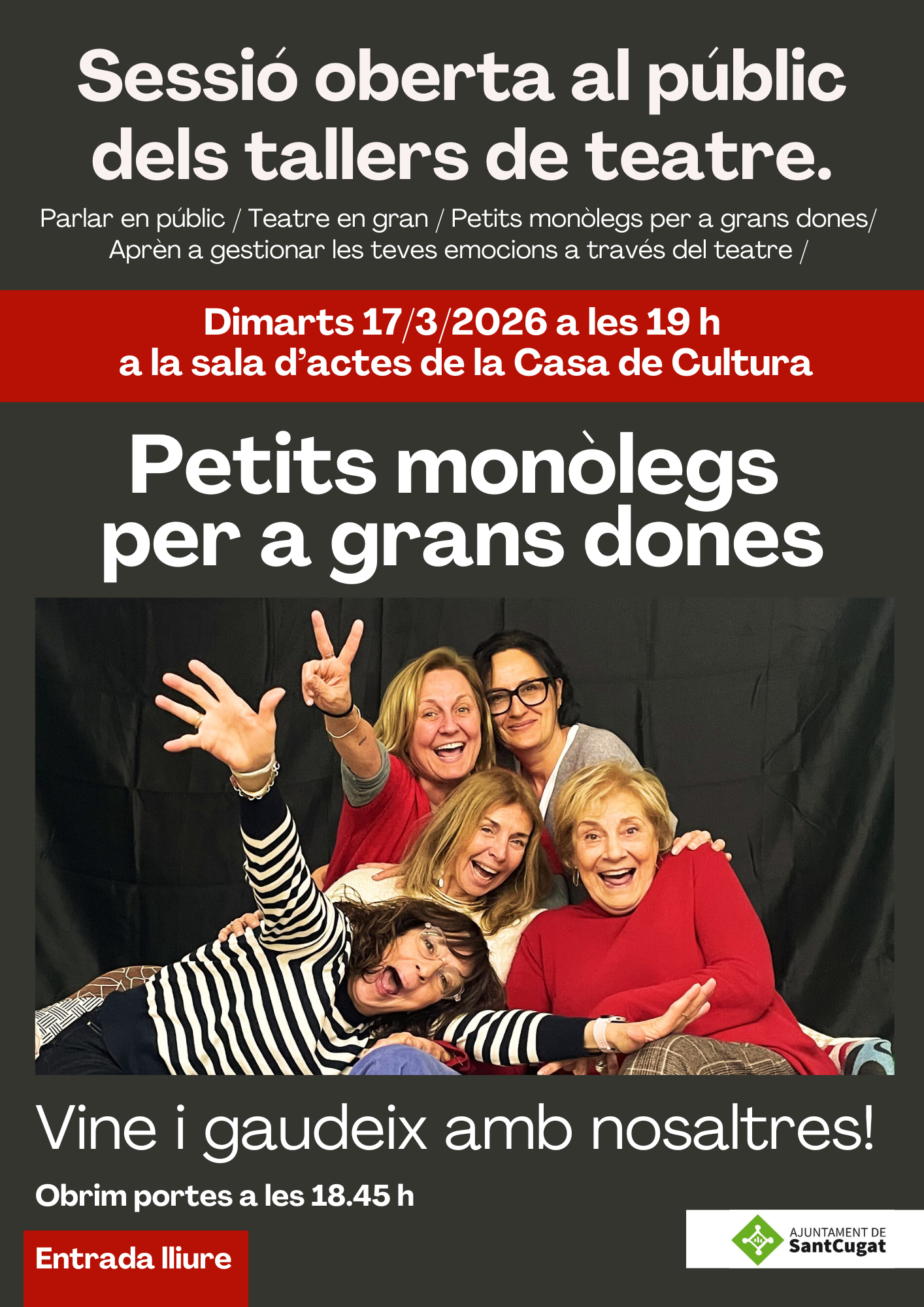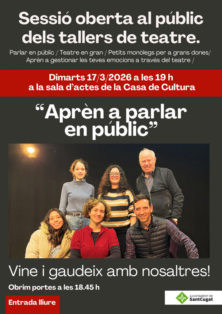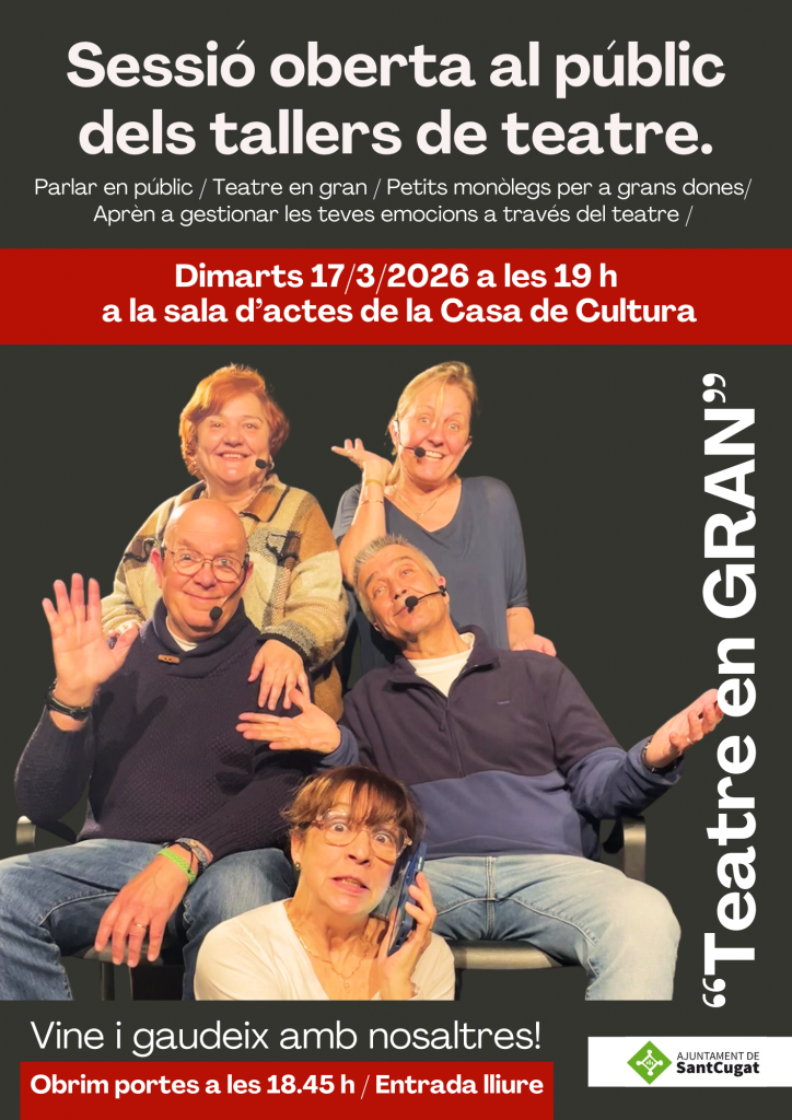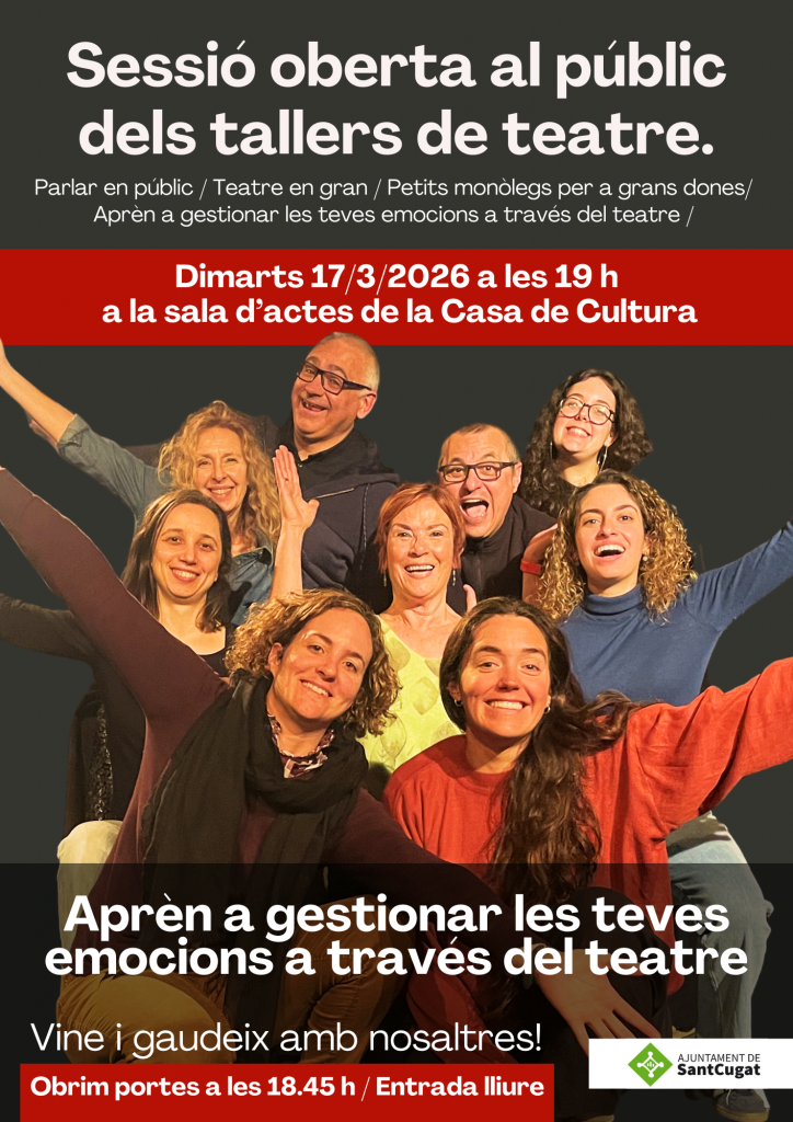 El pròxim dimarts, 17 de març, a partir de les 19 h, us esperem amb molta il·lusió a la Sala d’Actes de la Casa de Cultura de Sant Cugat, on els i les alumnes dels tallers de “Teatre per aprendre” mostraran davant del públic el resultat del seu procés creatiu.